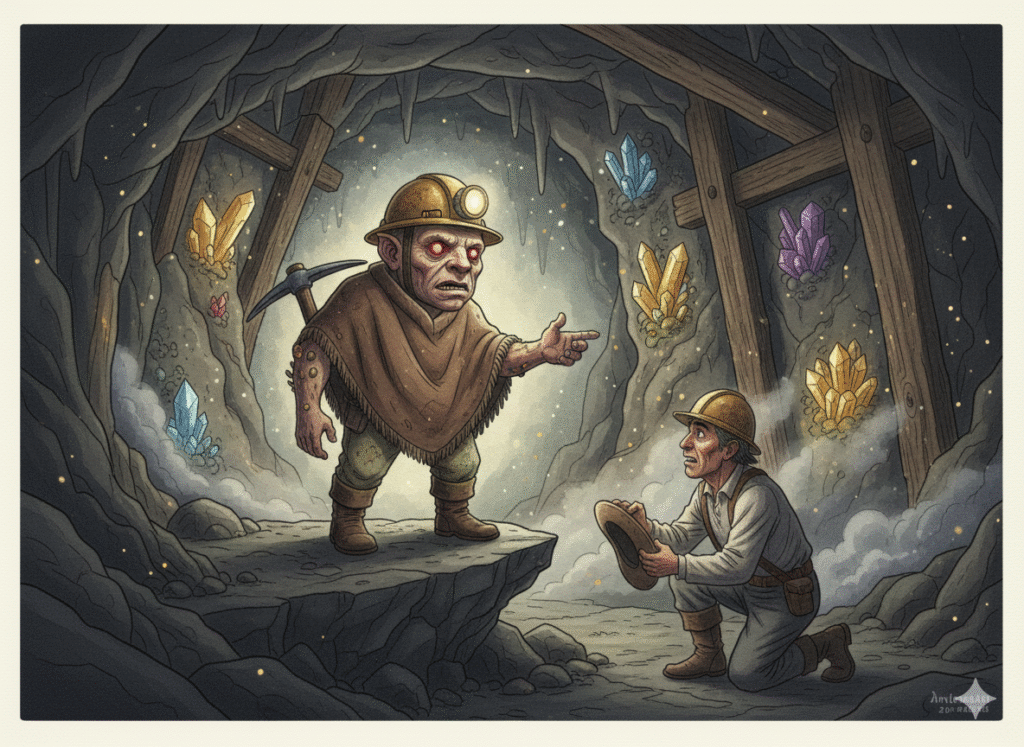 El Muqui es el dueño, guardián y espíritu tutelar de las minas. Su existencia está ligada al metal y la riqueza subterránea. No tiene una maldición en el sentido tradicional, sino una función: castigar o recompensar a los mineros según su comportamiento, su respeto por la mina y su avaricia. Si un minero es respetuoso y no abusa de la tierra, el Muqui puede mostrarle una veta rica o llenar su carretilla de mineral. En cambio, si el minero es codicioso, irresponsable o irrespetuoso, el Muqui puede esconder el mineral, causar derrumbes menores o incluso hacer que el trabajador se pierda en los laberínticos túneles.